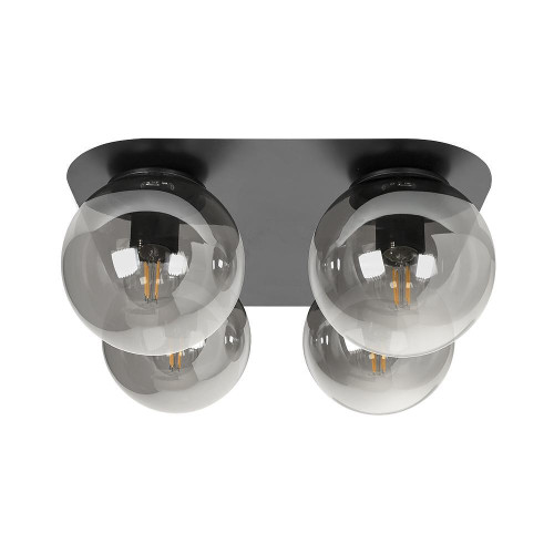 Стилен и модерен плафон от серията Берлин, изработен от черен цвят квадратна метална основа на цокъл Е27 с четири опушен сив цвят сферични стъклени разсейвателя. Плафон, подходящ за вашия хол, трапезария, спалня, хотел и ресторант, който ще изпълни дома ви със стил и уют.