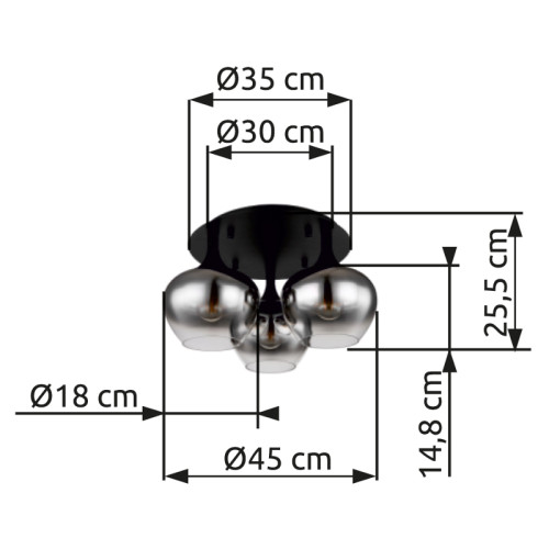 Елегантен плафон с модерен дизайн от серията Maxy, изработен от черен цвят метална основа и три куполовидна форма стъклени чашки в опушен цвят, преливащ към прозрачен. Оригинално решение за интериорното осветление във вашия хол, трапезария, хотел и ресторант.