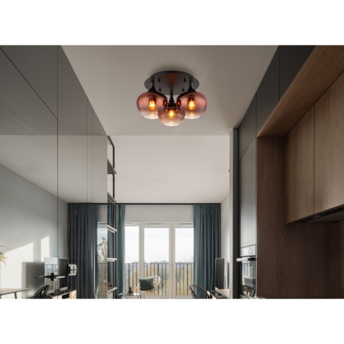 Елегантен плафон с модерен дизайн от серията Maxy, изработен от черен цвят метална основа и три куполовидна форма стъклени чашки в цвят мед, преливащ към прозрачен. Оригинално решение за интериорното осветление във вашия хол, трапезария, хотел и ресторант.