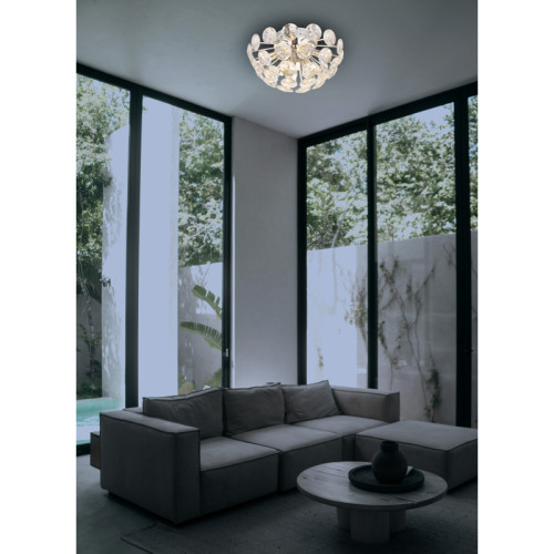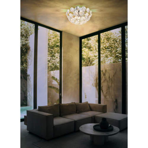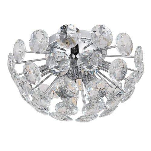 Стилен плафон с оригинален дизайн от серията Virina, изработен от цвят хром полусферично метално тяло и разсейвател от прозрачни кристали. Качествена лампа, подходяща за комфортното осветление на вашия хол, трапезария, спалня, хотел и заведение.