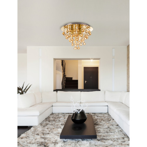 Изискан плафон със стилен дизайн от серията London, изработен от златиста метална основа и пищна висяща декорация от цвят кехлибар акрилни кристали. Чудесно предложение за комфортното осветление на вашия хол, трапезария, спалня, хотел и заведение.