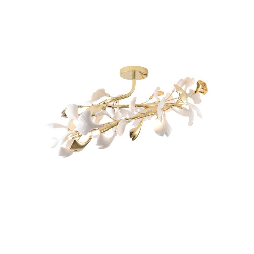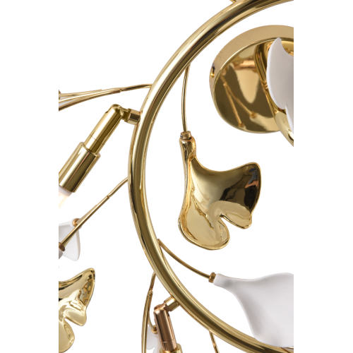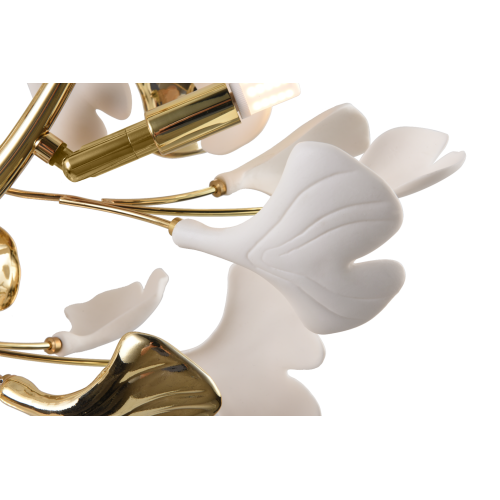Стилен плафон с оригинален дизайн от серията Leaf, изработен от златист цвят метално тяло и красиви декоративни керамични детайли с флорален мотив. Класическа лампа, подходяща за стилното осветление на вашия хол, трапезария, спалня, хотел и заведение.