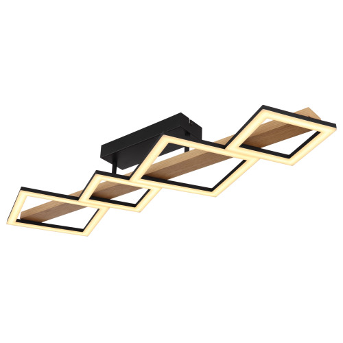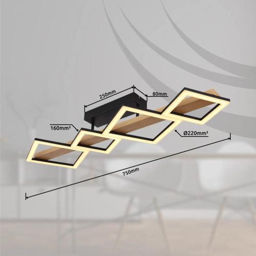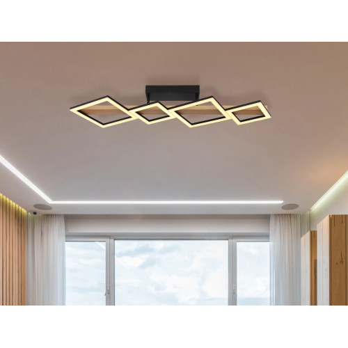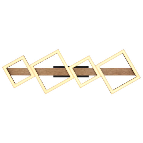 Стилен и модерен LED плафон от серията Dustin, изработен от черен цвят правоъгълна метална основа и рамо от тъмно кафяв цвят дърво с четири черен цвят алуминиеви квадрата с опал пластмасови разсейватели. Плафон, подходящ за осветление във вашия хол, трапезария, спалня, хотел или ресторант.