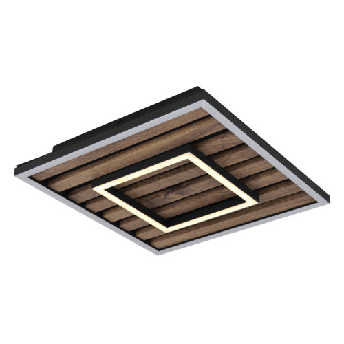 Оригинален светодиоден плафон от серията Woody, изработен от матово черен цвят метална основа с квадратно тяло от MDF дървени елементи и матово черни алуминиеви рамки с бели пластмасови разсейватели и вграден 18W 3000K LED. Модерно предложение за интериорното осветление на вашия хол, трапезария, спалня, коридор, хотел и заведение.
