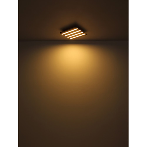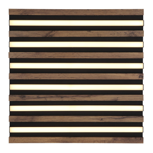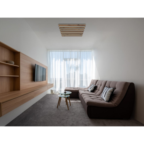 Модерен светодиоден плафон от серията Hayden, изработен от матово черен цвят квадратна метална основа с MDF дървени декоративни елементи и алуминиеви рамена с бели пластмасови разсейватели и вграден 30W 3000K LED. Атрактивно решение за интериорното осветление на вашия хол, трапезария, спалня, коридор, хотел и заведение.