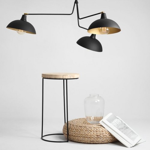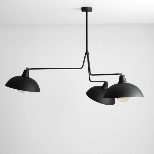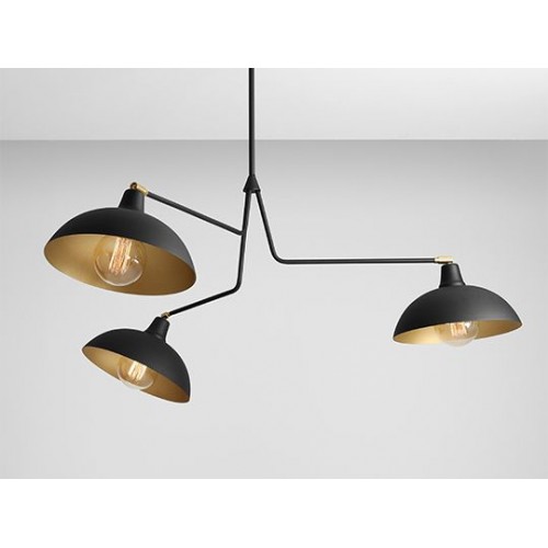 Оригинален полилей с функционален дизайн от серията Espace, изработен от черен мат цвят метална основа с три асиметрични рамена и напълно регулириуеми полусферични метални чашки в черен мат цвят отвън и златист във вътрешността на цокъл Е27. Модерно решение за комфортното и стилно осветление на вашия хол, трапезария, спалня, офис, хотел и заведение.