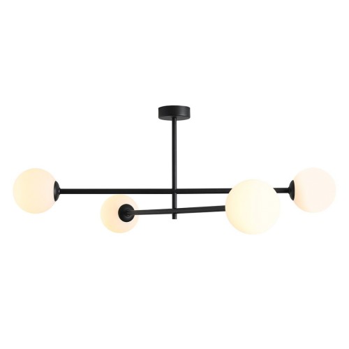 Модерен полилей с минималистичен дизайн от серията Pinne, изработен от черен цвят метална основа с прави рамена и четири бял цвят сферични стъклени чашки на цокъл Е14. Оригинално предложение за комфортното и стилно осветление на вашия хол, трапезария, спалня, офис, хотел и заведение.