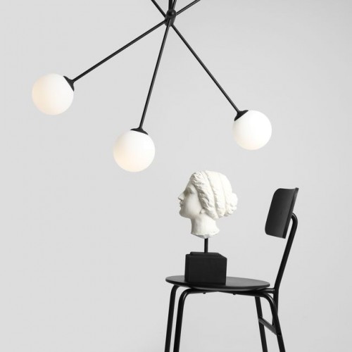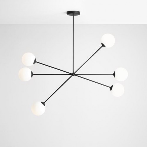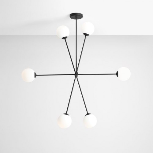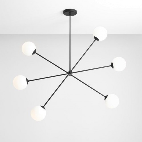 Модерен полилей с елегантен дизайн от серията Ohio, изработен от цвят черен мат метална основа и регулируеми рамена с шест бял мат сферични стъклени чашки на цокъл Е14. Чудесно предложение за комфортното осветление на вашия хол, трапезария, спалня, хотел и заведение.