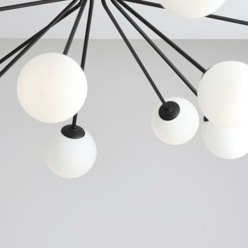 Елегантен полилей от серията Holm, изработен от черен мат метална основа с подвижни прави рамена и десет бял мат сферични стъклени чашки на цокъл Е14. Модерно предложение за комфортното и стилно осветление на вашия хол, трапезария, спалня, хотел и заведение.