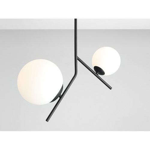 Оригинален полилей с модерен дизайн от серията Gallia, изработен от черен цвят метална основа и рамена с две матово бял цвят сферични стъклени чашки на цокъл Е27 и Е14. Стилно решение за комфортно осветление на вашия хол, трапезария, спалня, хотел и заведение.
