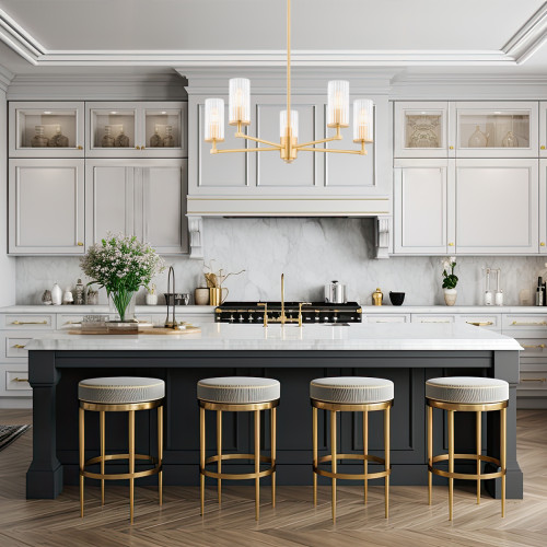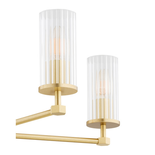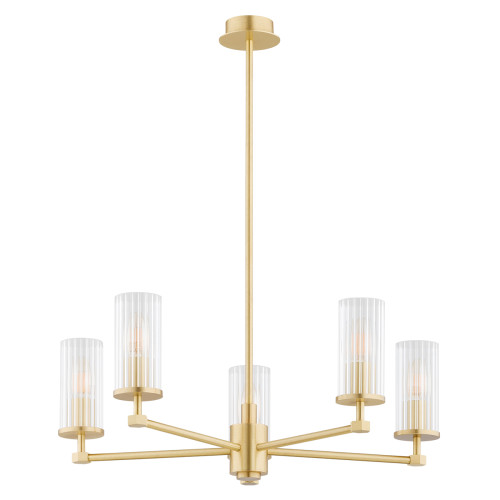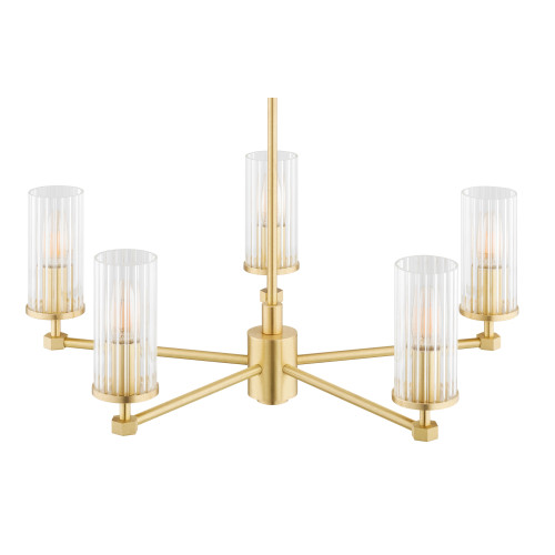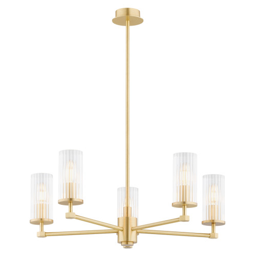 Съвременен полилей от серията Hampton, изработен от месингова основа с прави рамена и пет набраздени прозрачни стъклени чашки в цилиндрична форма. Стилно предложение за интериорното осветление на вашия хол, трапезария, спалня, хотел и ресторант.