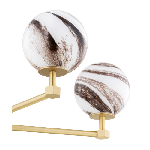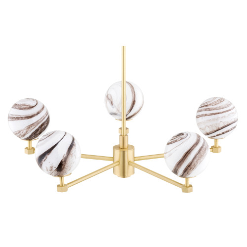 Стилен полилей с оригинален дизайн от серията Aruba, изработен от месингова основа с пет рамена и сферична форма стъклени чашки с бяло-кафява мраморна шарка. Модерно решение за комфортното осветление във вашия хол, трапезария, спалня, хотел и заведение.