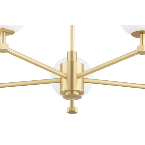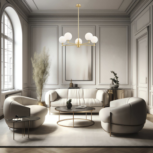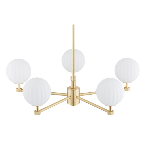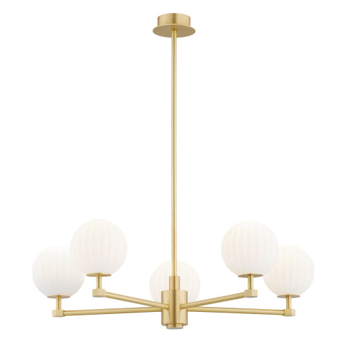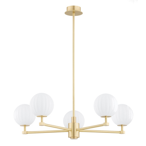 Стилен полилей от серията Paloma, изработен от месингова основа с пет прави рамена и сферична форма чашки от опал мат набраздено стъкло. Изискано предложение за качественото и комфортно осветление на вашия хол, трапезария, спалня, хотел и ресторант.