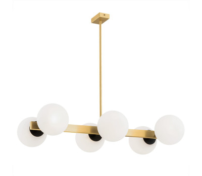 Стилен полилей от серията Freemont, изработен от цвят матиран месинг метална основа и шест опал стъклени чашки в сферична форма с черни метални детайли. Лампа, която ще придаде модерен стил на вашия хол, трапезария, спалня, хотел и заведение.