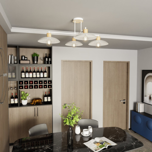 Оригинален полилей в скандинавски стил от серията Kobe, изработен от бял цвят метална основа и четири полусферични перфорирани метални чашки с натурални дървени елементи. Модерно решение за интериорното осветление във вашия хол, трапезария, спалня, хотел и заведение.