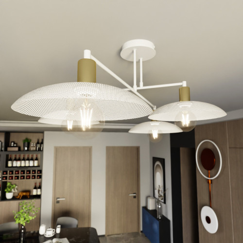 Модерен полилей в стил лофт от серията Spirit, изработен от бял цвят метална основа и четири полусферични перфорирани метални чашки със златисти метални елементи. Стилно предложение за интериорното осветление във вашия хол, трапезария, спалня, хотел и заведение.