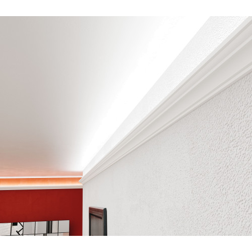 Благодарение на технология AeroFoamX™, профилът разполага със специална въздушна структура, която осигурява стабилност при минимално тегло. Това позволява бърз монтаж, перфектно прилягане към стената и тавана и равномерно светлинно разпределение без визуални дефекти. Създава изключителен и иновативен ефект в интериора. Произведен е от XPS ( фибран) или така наречения екстрадиран пенополистирол. При втърдяването на XPS се получава хомогенна пяна с микроскопични затворени въздушни джобчета, което го прави много лек, здрав и същевременно водоустойчив и много удобен за монтаж. За монтажа има няколко изисквания: залепянето за стената да се прави с монтажно лепило( без разтворител); шпаклова се с гипсово лепило на фугата между два профила( около 5 см.); боядисването е задължително - като се използва боя на водна основа или латекс. Препоръчва да се монтира Г-образен алуминиев профил в канала предварително, като цената е: 3.50 EUR с ДДС/ за 2 метра. Профилът за скрито осветление се предлага на парче от 2м. , цената в сайта е за 2м. Няма включена светодиодна лента в комплекта. Профилът е подходящ за осветление във вашия хол, трапезария, спалня, хотел и ресторант.