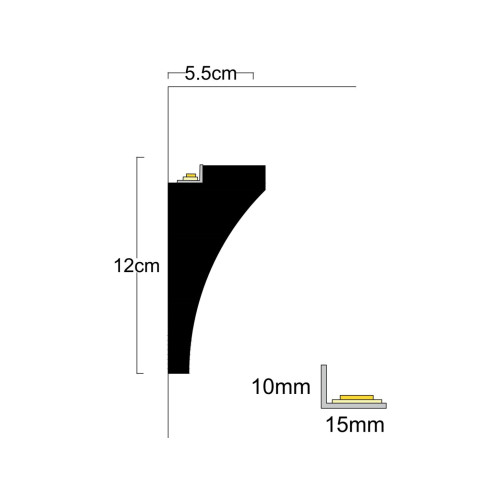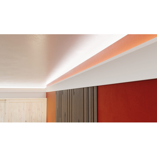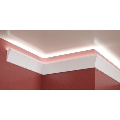 Създава изключителен и иновативен ефект в интериора. Произведен е от XPS ( фибран) или така наречения екстрадиран пенополистирол. При втърдяването на XPS се получава хомогенна пяна с микроскопични затворени въздушни джобчета, което го прави много лек, здрав и същевременно водоустойчив и много удобен за монтаж. За монтажа има няколко изисквания: залепянето за стената да се прави с монтажно лепило( без разтворител); шпаклова се с гипсово лепило на фугата между два профила( около 5 см.); боядисването е задължително - като се използва боя на водна основа или латекс. Препоръчва да се монтира Г-образен алуминиев профил в канала предварително, като цената е: 3.50 EUR с ДДС/ за 2 метра. Профилът за скрито осветление се предлага на парче от 2м. , цената в сайта е за 2м. Няма включена светодиодна лента в комплекта. Профилът е подходящ за осветление във вашия хол, трапезария, спалня, хотел и ресторант.