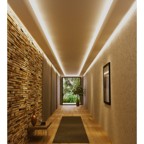Създава изключителен и иновативен ефект в интериора, светещ двустранно индиректно с улеи за LED лента, както може да се монтират и LED луни за вграждане по дължината на профила. Произведен е от XPS ( фибран) или така наречения екстрадиран пенополистирол. При втвърдяването на XPS се получава хомогенна пяна с микроскопични затворени въздушни джобчета, което го прави много лек, здрав и същевременно водоустойчив и много удобен за монтаж. За монтажа има няколко изисквания: залепянето за стената да се прави с монтажно лепило( без разтворител); шпаклова се с гипсово лепило на фугата между два профила( около 5 см.); боядисването е задължително - като се използва боя на водна основа или латекс. Препоръчва да се монтира и залепи Г-образен алуминиев профил в канала предварително, като цената е: 3.50 EUR с ДДС/ за 2 метра. Профилът за скрито осветление се предлага на парче от 2м. , цената в сайта е за 2м. Няма включена светодиодна лента в комплекта. Профилът е подходящ за осветление във вашия хол, трапезария, спалня, хотел и ресторант.