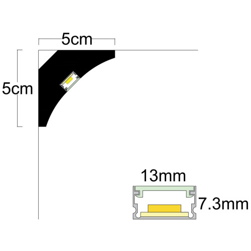 Профилът е с отделно място за монтаж на светодиодна лента в П-образен профил ( размер: 13мм х 73мм) с бял опал пластмасов разсейвател, светещ директно от стената. Произведен е от XPS ( фибран) или така наречения екстрадиран пенополистирол. При втърдяването на XPS се получава хомогенна пяна с микроскопични затворени въздушни джобчета, което го прави много лек, здрав и същевременно водоустойчив и много удобен за монтаж. За монтажа има няколко изисквания: залепянето за стената да се прави с монтажно лепило( без разтворител); шпаклова се с гипсово лепило на фугата между два профила( около 5 см.); боядисването е задължително - като се използва боя на водна основа или латекс. Препоръчва да се монтира и залепянето на П-образен алуминиев профил в канала предварително, като цената е: 5.00 EUR с ДДС/ за 2 метра. Профилът за скрито осветление се предлага на парче от 2м. , цената в сайта е за 2м. Няма включена светодиодна лента в комплекта. Профилът е подходящ за осветление във вашия хол, трапезария, спалня, хотел и ресторант.