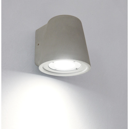 Оригинален фасаден аплик от серията Kiara, изработен от сив цвят бетонна основа и канусовидна форма бетонна чашка на цокъл GU10 с висока степен на влагозащита: IP65. Модерно предложение за екстериорното осветление на фасадата, терасата и верандата във вашия дом, офис, хотел и ресторант.
